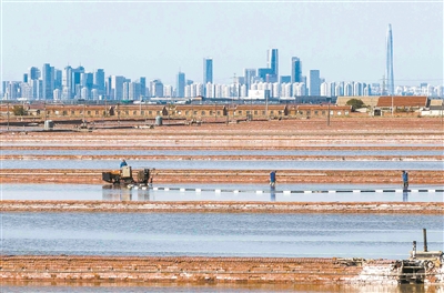 连日来,在天津市滨海新区的天津长芦海晶集团有限公司25万亩盐田里,工人利用晴好天气开展“春扒”作业,百里盐滩一片繁忙。据悉,该集团今年春晒计划产盐50万吨,截至一季度已完成24.8万吨,实现生产“开门红”。新华社记者 赵子硕 摄