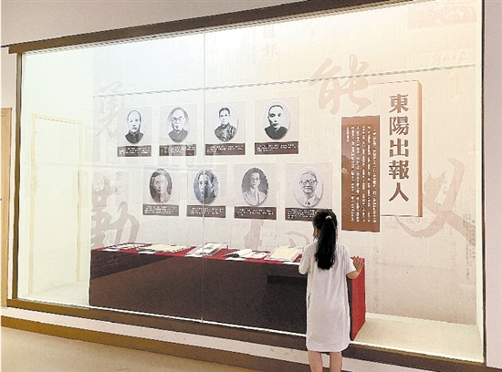 展厅入口处,是一面“东阳出报人”展柜,在印有东阳人五大特质“勤勇韧能义”的背景墙上,张贴着蔡汝霖、马文车、邵飘萍等东阳籍报人的照片及简介,一代又一代的东阳有志报人在他们的时代里,用自己的智慧与生命书写了充满热血与信念的爱国篇章。