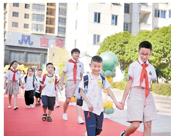 图二:昨日,巍山第一小学教育集团巍山校区一年级新生入学报到。当日,学校为每位新生精心准备了“竹娃”徽章以及一年级班主任手写的书签,并组织六年级学生带领一年级新生走红地毯、参观校园。