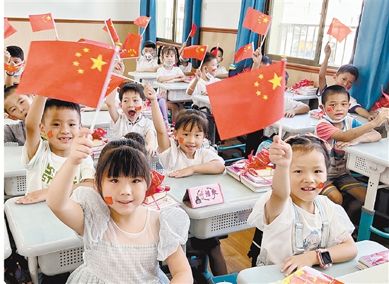图一:昨日,城东街道李宅小学迎来了一年级新生,他们手拿小国旗,认真地听着老师的介绍。新学年开始,李宅小学开展爱国主义主题迎新教育,将爱国主义思想厚植学生心中。