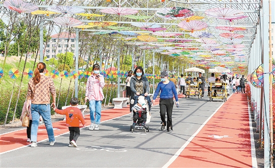 ◀受疫情影响,清明假期,市民纷纷选择郊区、乡村踏春游玩,亲近自然,放松身心,享受假日美好时光。图为游客在花园村花园现代农业生态园内游玩。
