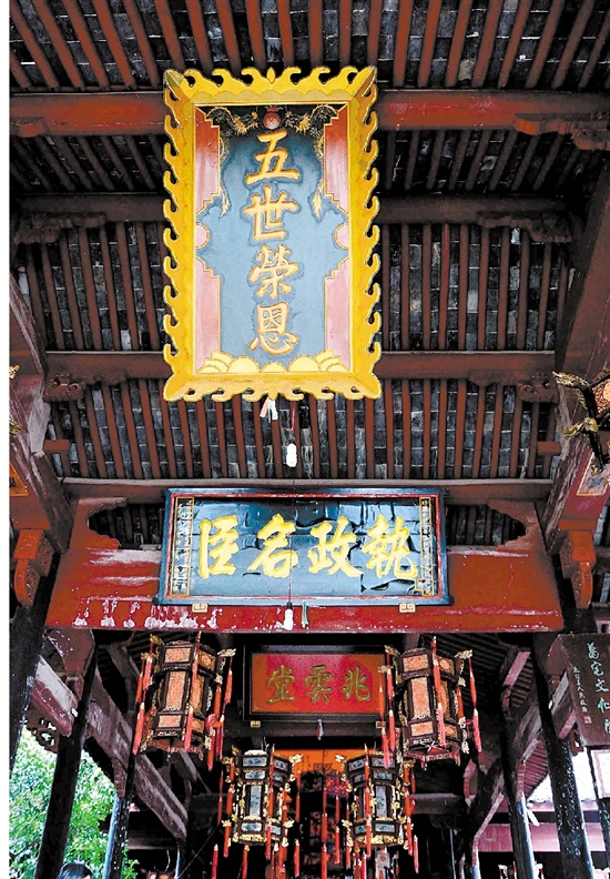 虎鹿镇葛宅村葛氏宗祠内,杜范所题“执政名臣”匾额,以及朝廷所赐葛洪一门“五世荣恩”匾额。