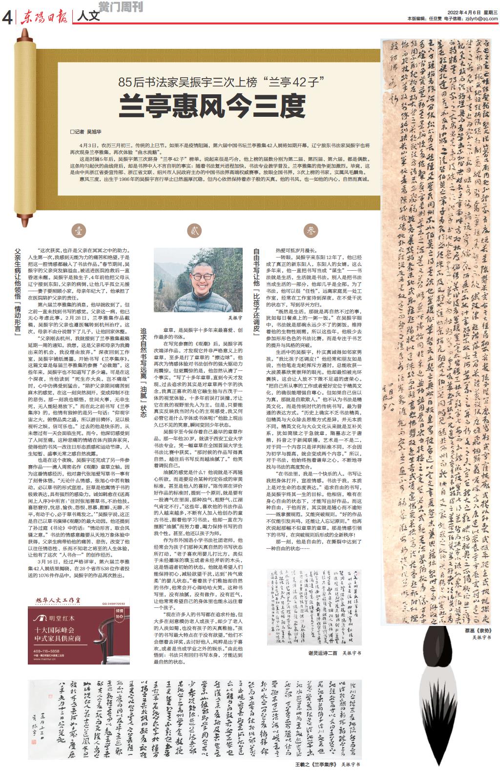4月3日,农历三月初三,传统的上巳节。如果不是疫情阻隔,第六届中国书坛兰亭雅集42人展将如期开幕,辽宁旅东书法家吴振宇也将再次现身兰亭雅集,再次体验“曲水流觞”。
