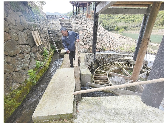 水磨房的工作原理是在水流的强大冲力下,水轮快速转动,并通过中间那根连接水轮与磨盘的磨轴,带动房间里的磨盘转动。