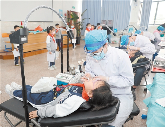 近日,我市启动新一轮适龄学生免费窝沟封闭预防龋齿项目行动。图为市中医院(口腔医院)组织医护人员上门给全市二、三年级的小学生进行窝沟封闭与检查。