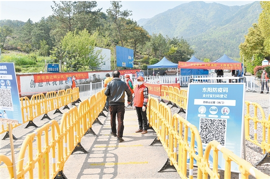 清明假期,因疫情防控需要,我市各大公墓实行“先预约后文明祭扫”的措施,市民应戴口罩通过扫防疫码登记信息,经过测温、亮码等流程有序入园扫墓,祭扫完毕尽快离场,防止扎堆聚集。图为西甑山公墓出入口现场,前来祭扫的市民经扫防疫码、测温等程序,有序进入园区祭扫。 记者 包康轩