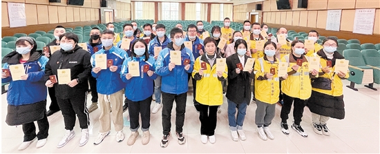 参加网约送餐行业工会联合会第一次代表大会的会员代表拿着工会会员证合影。