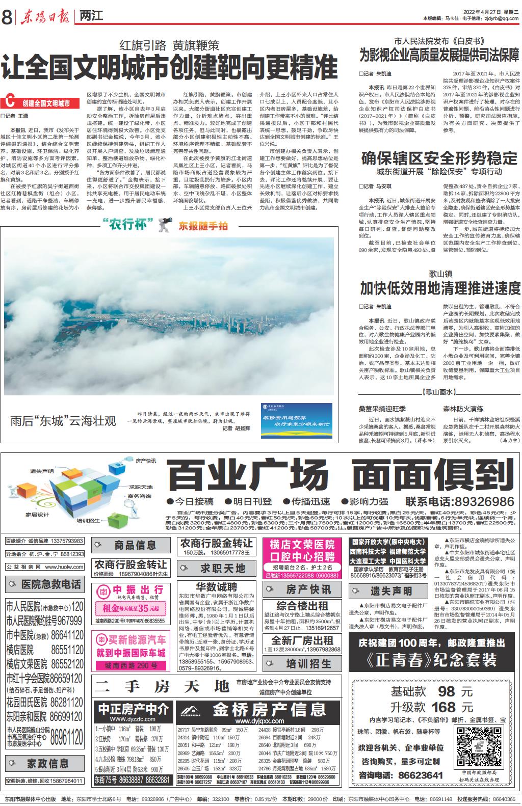 本报讯 近日,我市《发布关于城区十佳文明小区第二批第一轮测评结果的通报》,结合综合文明素养、基础设施、环卫保洁、绿化养护、消防设施等多方面考评因素,对城区街道40个小区进行评分排名,对前3名和后3名,分别授予红旗和黄旗。