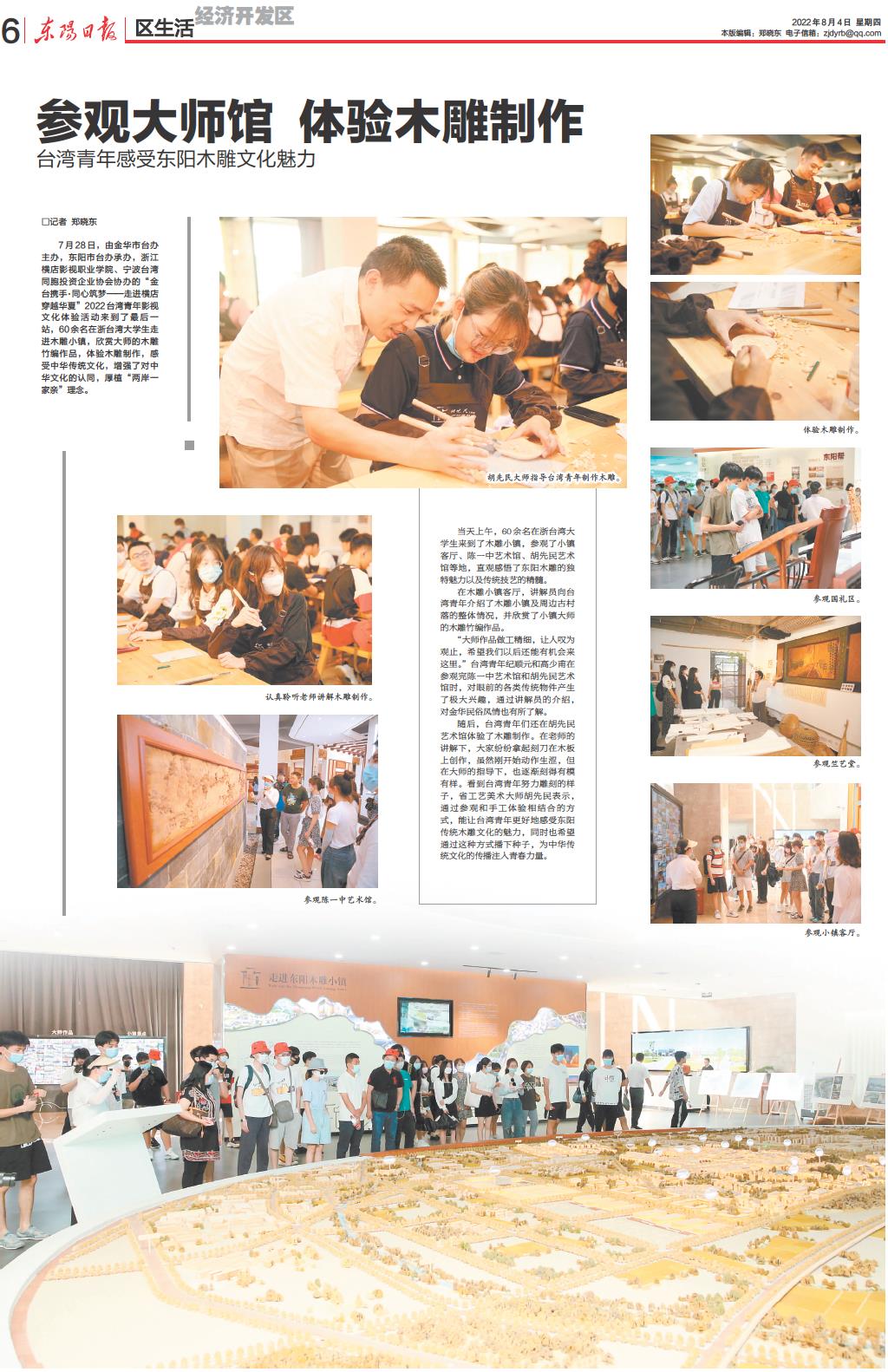 7月28日,由金华市台办主办,东阳市台办承办,浙江横店影视职业学院、宁波台湾同胞投资企业协会协办的“金台携手·同心筑梦——走进横店穿越华夏”2022台湾青年影视文化体验活动来到了最后一站,60余名在浙台湾大学生走进木雕小镇,欣赏大师的木雕竹编作品,体验木雕制作,感受中华传统文化,增强了对中华文化的认同,厚植“两岸一家亲”理念。