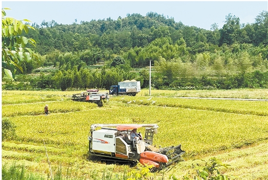 眼下,在湖溪镇白水口村,两台收割机正在稻浪里来回穿梭,金黄的稻穗还引来一群群白鹭争相觅食,共享丰收。