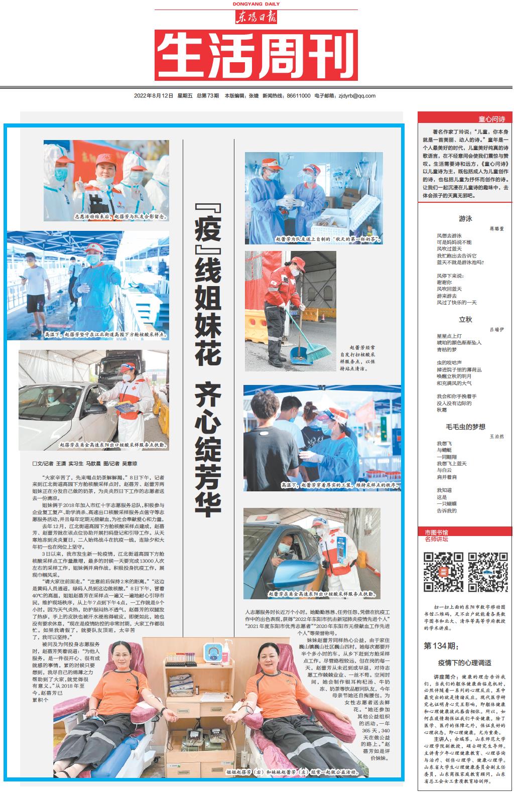 去年12月,江北街道高园下方舱核酸采样点建成,赵蓓芳、赵蕾芳就在该点位协助开展扫码登记和引导工作。从天寒地冻到炎炎夏日,二人始终战斗在抗疫一线,连除夕和大年初一也在岗位上坚守。
