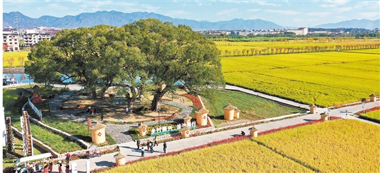 深秋时节,城东街道寀卢村共享田园里的千亩双季晚稻丰收在即,从空中俯瞰大地,金色的稻田稻浪翻滚,与错落的村舍构成一幅美丽的田园丰收画卷,吸引不少游客和摄影爱好者前来游玩、拍照。 记者 包康轩