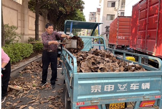 7日傍晚,在望江小区一绿化带旁,小区事务组组长王春凤、支委卢晓兰等人正挥着铁铲,把陈年枯叶铲到三轮车上。