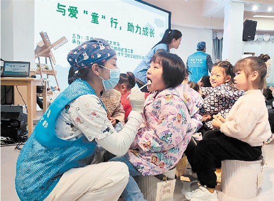 本报讯 近日,为了帮助儿童从小树立口腔保健的正确意识,养成口腔清洁的好习惯,江北街道联合市民政局等单位在江北实验幼儿园举办与爱“童”行、助力成长关爱牙齿健康志愿服务活动。