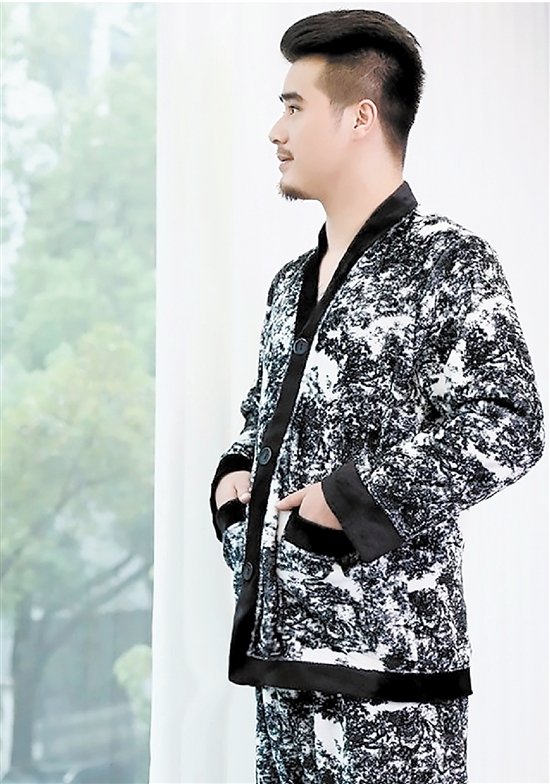 张凯化身男模,展示自家企业设计开发的服装。
