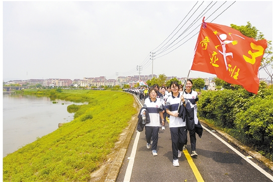 上午9时30分,全体高三师生举行毅行动员大会。10时,师生们正式开始了毅行征程,他们沿着南江边的步行道,溯江而上,向着南强根源——横店镇官桥村逐梦前行。为了不让学生感到疲惫,高三(5)班学生卢炜鑫家长还特意在途中为班级中的每位师生送上一盒水果。