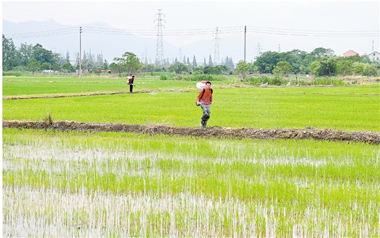 昨日,城东街道东光村附近的农田里,农民在给早稻喷洒农药。眼下,我市各地早稻栽插已完成,进入田间管理阶段,农业部门积极引导农民采取科学管水、合理施肥、加强病虫防治等管护措施,确保早稻正常生长,助力粮食丰产丰收。 记者 包康轩