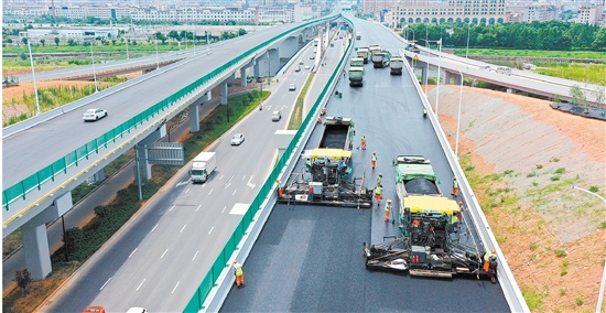 高温天摊铺沥青正当时。昨日,施工人员在义东高速江北至南市段摊铺沥青,抢抓施工进度。据了解,目前该项目已完成路基工程的100%、桥涵工程的100%、隧道工程的100%、路面工程的89%、交安工程的57.5%、绿化工程的100%、机电工程的25%、房建工程的45%,共完成总体形象进度95.8%。 记者 包康轩 通讯员 许田悦 唐艳宁