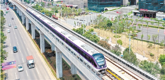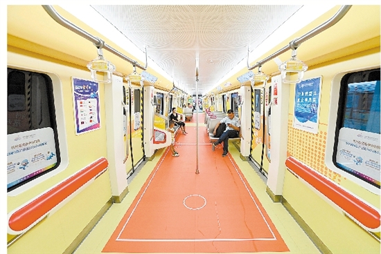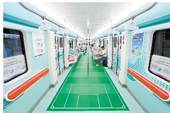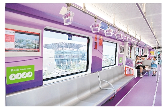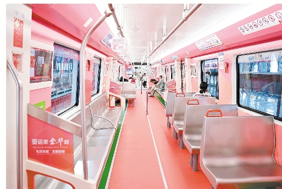 为迎接杭州亚运会,轨道交通“金彩”亚运号主题专列车身由原先的红色改为亚运会色系中的虹韵紫,车身内外绘制杭州亚运会口号、会徽、吉祥物等核心元素。6节车厢分别按“亚运轨迹”“百舸争流”“绿茵追逐”“激情藤球”“水墨金华”“金彩以待”等六大主题装饰,宣传介绍亚运知识、八婺文化及城市风貌等,为乘客打造沉浸式亚运体验。图一:昨日,“金彩”亚运号主题专列从木雕城站驶出。图二、三、四、五:“金彩”亚运号主题专列车厢内景。 记者 包康轩