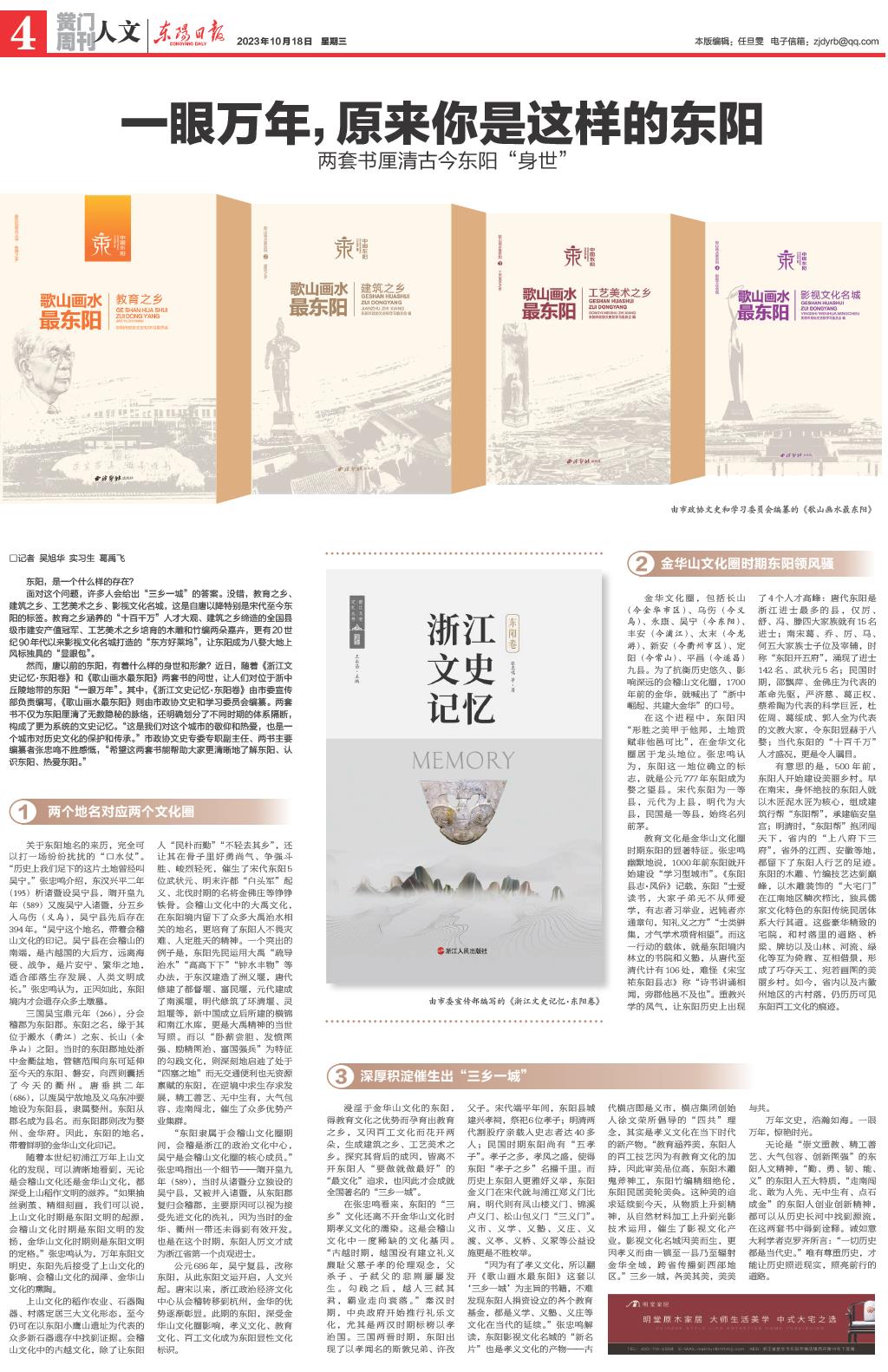 教育文化是金华山文化圈时期东阳的显著特征。张忠鸣幽默地说,1000年前东阳就开始建设“学习型城市”。《东阳县志·风俗》记载,东阳“士爱读书,大家子弟无不从师爱学,有志者习举业,迟钝者亦通章句,知礼义之方”“士类骈集,才气学术项背相望”。而这一行动的载体,就是东阳境内林立的书院和义塾,从唐代至清代计有106处,难怪《宋宝祐东阳县志》称“诗书讲诵相闻,旁郡他邑不及也”。重教兴学的风气,让东阳历史上出现了4个人才高峰:唐代东阳是浙江进士最多的县,仅厉、舒、冯、滕四大家族就有15名进士;南宋葛、乔、厉、马、何五大家族士子位及宰辅,时称“东阳开五府”,涌现了进士142名、武状元5名;民国时期,邵飘萍、金佛庄为代表的革命先驱,严济慈、葛正权、蔡希陶为代表的科学巨匠,杜佐周、葛绥成、郭人全为代表的文教大家,令东阳显赫于八婺;当代东阳的“十百千万”人才盛况,更是令人瞩目。