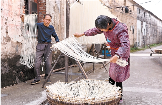 画水镇高平村是远近闻名的索面制作村,至今仍有十几户农户以此谋生。索面制作需经过揉面、擀面、切面、盘面、绕面、拉面、晒面、收面等一系列工序,其中多个环节都要依赖加工户丰富的经验。得益于代代相传的制面手艺,高平村的面条柔软筋道。近日,村内随处可见晒面场景,成为一道独特的风景线。 记者 胡扬辉
