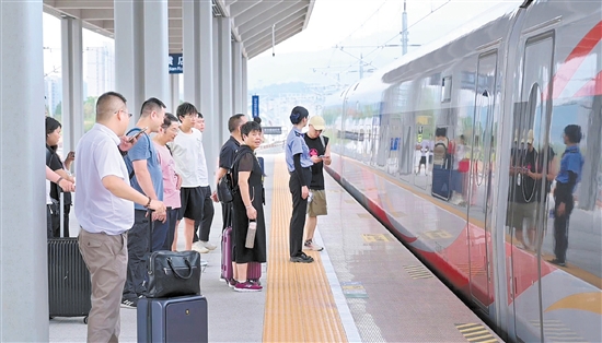 10日下午,乘客在高铁横店站乘坐高铁。杭温高铁6日开通运营以来,截至昨日下午6时,横店站已发送旅客1.3万余人,日均发客2200余人。