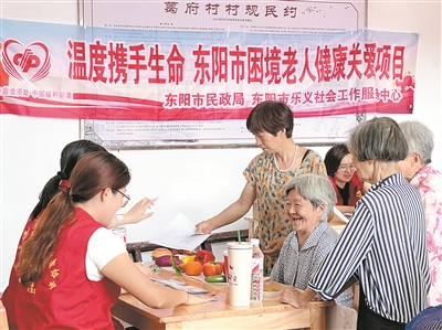昨日,由市民政局主办、市乐义社会工作服务中心承办的“温度携手生命 东阳市困境老人健康关爱项目”社区扩大活动之——守护记忆、智趣游园会在南马镇葛府村举行。图为社工及义工开展快速认知筛查、知识趣味问答,向老人普及健康饮食习惯。现场还设置政策咨询台,宣传社会救助等相关政策。通讯员 周志伟