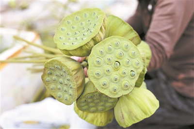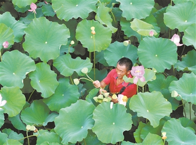昨日,江北街道添淇家庭农场十余亩荷田里的荷花竞相绽放,采莲人在荷田里穿梭采摘成熟的莲蓬。据了解,荷田里不仅可以采摘莲蓬,荷叶、荷花更是得到不少花店、剧组的青睐,前来采购的客户络绎不绝。该农场负责人说,目前荷叶售价1元,荷花每朵2.5元,莲蓬10元3个,供不应求。