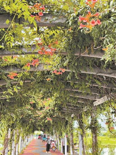 昨日,城东街道寀卢村共享田园的紫藤长廊里,一串串凌霄花绽放,在绿叶的映衬下显得格外漂亮。眼下,凌霄花已进入盛花期,为共享田园增添了一抹灵动的亮色,吸引市民游客前来观赏、游玩。