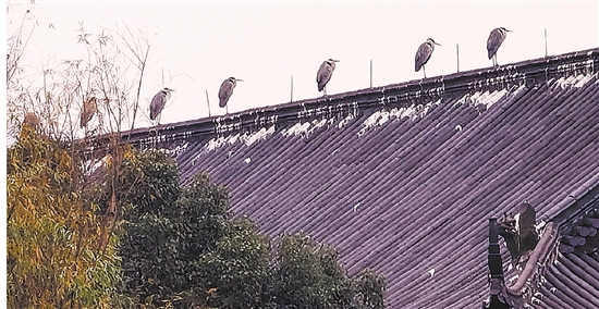 周末去江边散步,看到几只苍鹭像音符一样排着队站在屋顶上。