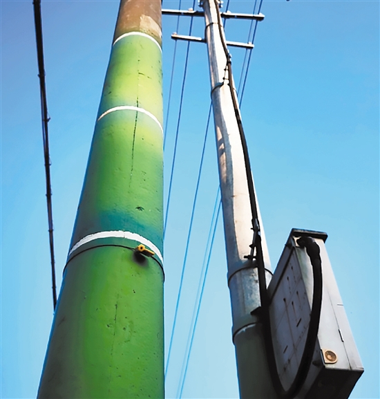电线杆穿了一层“竹子外衣”,给美丽乡村增添了新景。