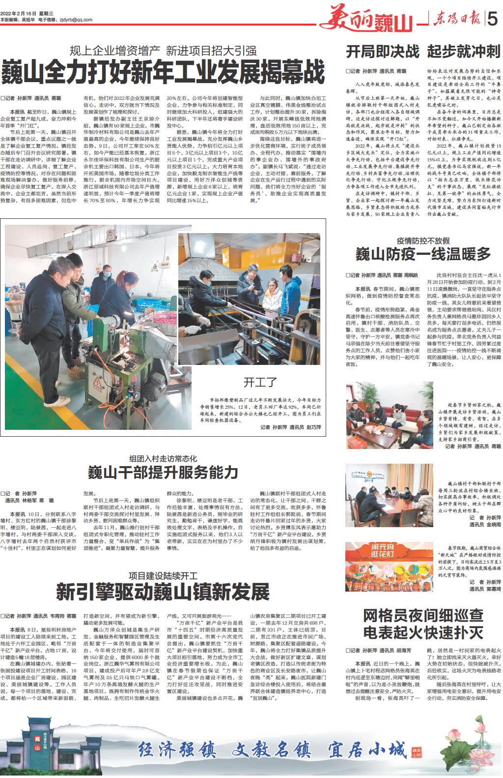 - 巍山全力打好新年工业发展揭幕战 □记者 孙新萍 通讯员 蒋璐 本报讯 截至昨日,巍山镇规上企业复工复产超九成,奋力冲刺今年首季“开门红”。 节后上班第一天,巍山镇召开全体镇干部会议,重点议题之一就是了解企业复工复产情况。