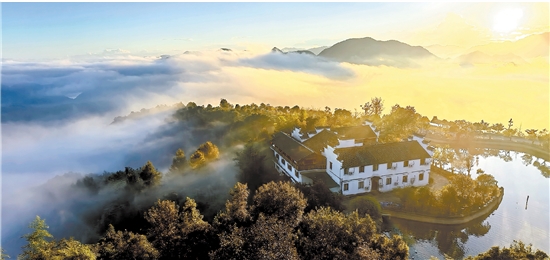 旭日东升,千万缕金光冲破晨雾,洒向东阳江镇天山村,美不胜收。