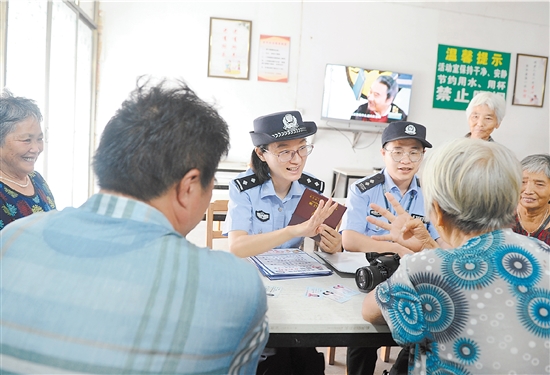 9日,市公安局南市派出所民辅警冒着高温酷暑,驱车来到辖区陈宅村,为村民提供户口簿补办、送身份证上门等服务,并为老年村民宣讲户籍相关政策及反诈防骗、夏季用火用电安全知识。图为民警现场受理户口簿更换业务。 通讯员 蔡伟华