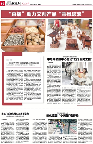 - “直播”助力文创产品“乘风破浪” □记者 楼瑶琳 “今天给大家分享一款米斗,四周用榫卯结构拼接。它的寓意非常好——斗出斗入,日进斗金……”8日下午,在东阳木雕小镇胡先民艺术馆内的明德众创空间,生其心电商行,主播许奇正在抖