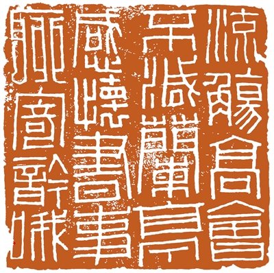 章法上,不囿于常态疏密关系:右侧第一行起手第一个“流”字,处理成一种仰角拍建筑物照片般的透视感,另3个字均处理成向左扭倾成略带平行四边形状,营造出小空间内的小动感;第二行则把前三字作为同一个整体进行同步透视处理,用最后一字来承接并调整章法动态;二三两行之间的上部,通过文字的大小宽窄处理,留出一处深V领般的空白,以营造一种对于印章来说并不常见的空间布局效果;第四行第一字跟另三字的笔画,一左倾三右倾,以营造出不同向的势。